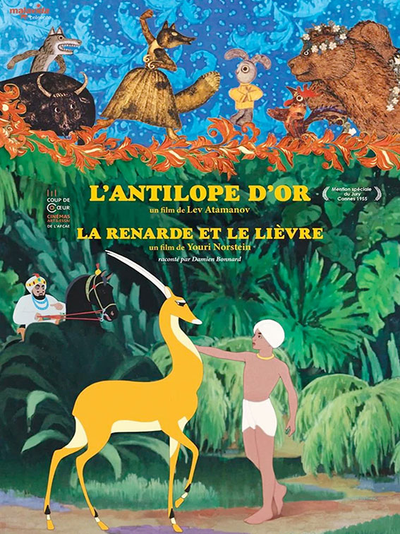 – L’Antilope d’or de Lev Atamanov (1954, 31′) : Au temps des Mille et Une Nuits, un maharaja avide poursuit une antilope dont les sabots produisent des pièces en or. Il capture son ami, un petit garçon, en espérant qu’il le mène à l’animal magique.
