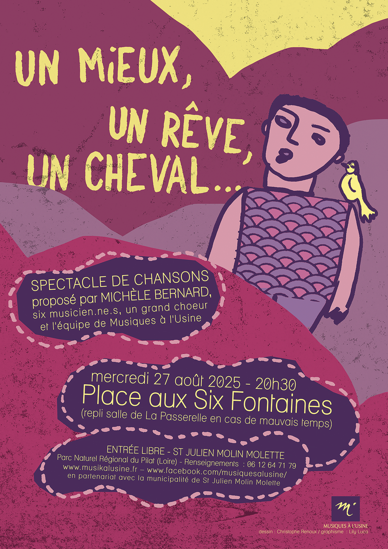 On est un peu tristes, mais on va quand même pouvoir vous chanter cette création mondiale « Un mieux, un rêve, un cheval », faite de chansons de Michèle Bernard, et aussi de William Sheller, Jeanne Moreau, Prévert et Kosma, Jean Nohain et Francis Poulenc, Chloé Lacan, Boris Vian, Angéline, …, et même Johnny Hallyday et Dalida ! Et puis on chantera aussi tous ensemble !
